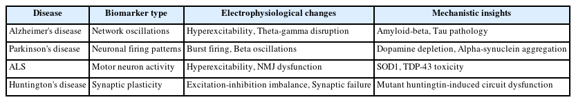 By focusing on animal model findings, we can interpret how such electrophysiological changes contribute to disease mechanisms. Below, we review mechanistic insights gleaned from electrophysiological studies in animal models of the four major neurodegenerative diseases - AD, PD, ALS, and HD - highlighting how these biomarkers illuminate pathological processes.