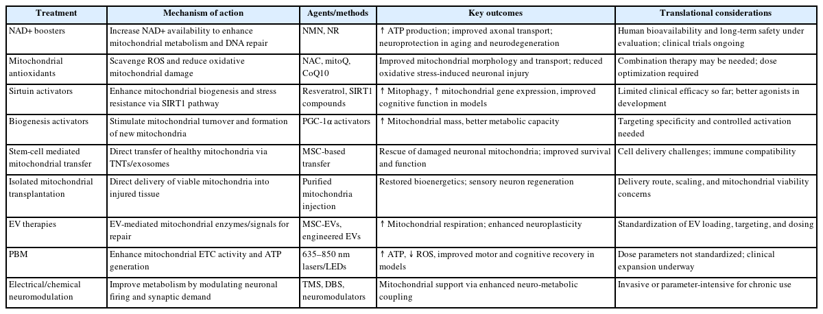 The persistence of proper mitochondrial function is crucial for neuronal health, given the central role of mitochondria in energy production, metabolic regulation, and calcium homeostasis in neurons. Mitochondrial dysfunction is a hallmark of many neurodegenerative diseases, underscoring the need for effective therapeutic strategies aimed at rejuvenating these organelles. This review discusses several promising therapeutic avenues: small molecule and metabolic modulation, mitochondrial augmentation therapies, and neuromodulatory and photonic approaches (Table 1).