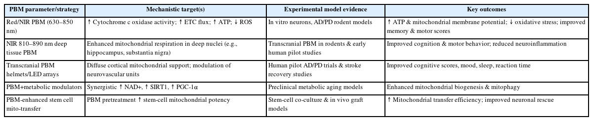 Photobiomodulation (PBM) refers to the use of low-level laser therapy, particularly in the red and near-infrared spectrum, to promote cellular repair and regeneration. Mechanistically, these wavelengths penetrate tissue and influence mitochondrial respiration by enhancing ATP synthesis and promoting mitochondrial biogenesis [41]. Studies have shown PBM can improve mitochondrial function, increase bioenergetics, and reduce oxidative stress in various models of neurodegeneration [42]. The safety and efficacy of this approach in clinical settings warrant further exploration, particularly in tandem with other therapeutic strategies for neurological disorders. A PBM-specific summary of biological targets, outcomes, and translational considerations is provided in Table 2.