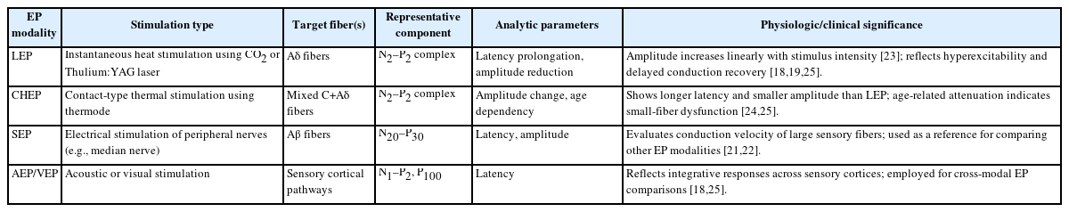 Second, inconsistencies in stimulation conditions and signal-analysis parameters across studies hinder direct data comparison. Variables such as stimulus intensity, repetition rate, baseline temperature, analysis filters, and averaging (windowing) methods differ widely, resulting in significant variation in EP waveform morphology and amplitude [47-49]. Particularly, discrepancies in the habituation rate and amplitude attenuation of LEPs during repetitive stimulation have been reported among studies, raising concerns about the reliability of EPs as indices of neural plasticity. This technical heterogeneity lowers clinical reproducibility and poses a major obstacle to establishing EPs as standardized objective evaluation markers.