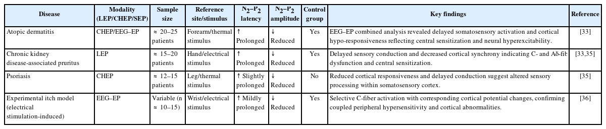 Furthermore, experimental models using electrical stimulation-induced itch have confirmed selective activation of C-fibers and corresponding changes in cortical potentials through EEG analysis, providing direct evidence that EPs simultaneously reflect both peripheral sensory hypersensitivity and cortical functional abnormalities [36]. Collectively, these findings suggest that EPs hold high clinical potential as a noninvasive electrophysiologic tool for objectively assessing sensory neural excitability in patients with chronic itch (Table 2, 3).
