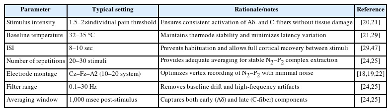 EPs can be elicited by thermal, electrical, or mechanical stimuli, and depending on the characteristics of the stimulus, specific sensory fibers such as Aδ- or C-fibers are selectively activated. In pruritus and pain research, CO2 or Thulium:YAG laser stimulation (LEP) and contact thermode stimulation (CHEP) are most commonly used [25]. These stimuli activate both myelinated and unmyelinated peripheral fibers to induce sensory input, and factors such as stimulus intensity, duration, and interstimulus interval critically determine reproducibility and accuracy.